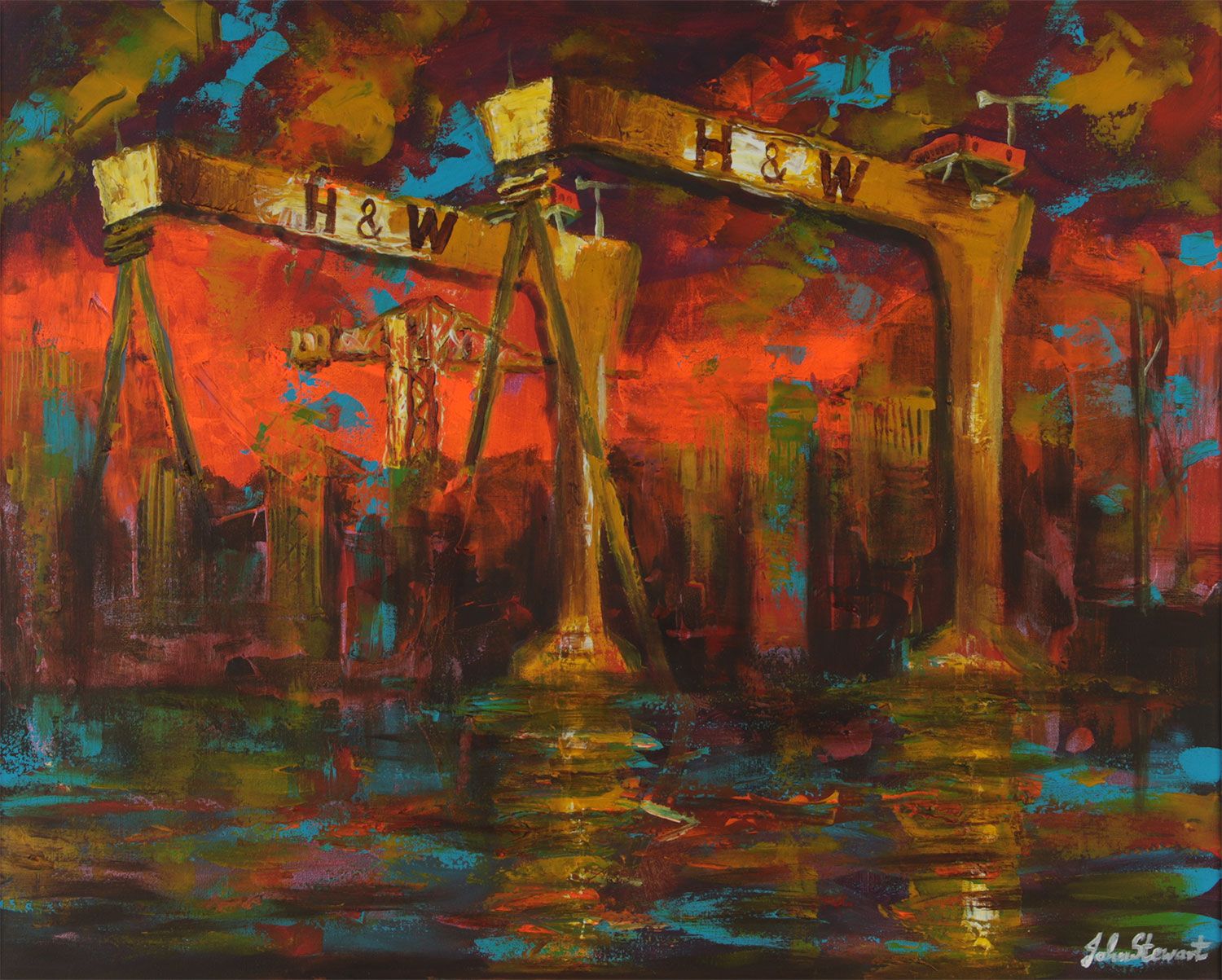 Keywords: John Stewart art, Belfast artist, original oil painting, Northern Ireland art, industrial heritage art, Harland & Wolff artwork, Belfast shipyard art, Irish artist, authentic Belfast artwork
