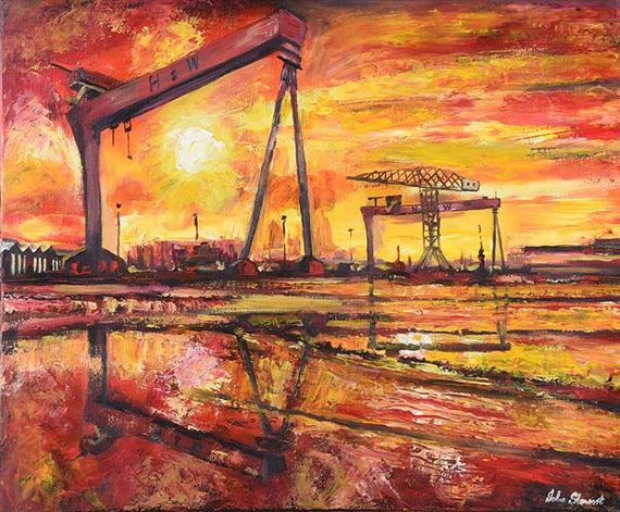 A vibrant oil painting capturing the iconic Harland & Wolff cranes at sunset over Belfast docks. Signed by the artist.
